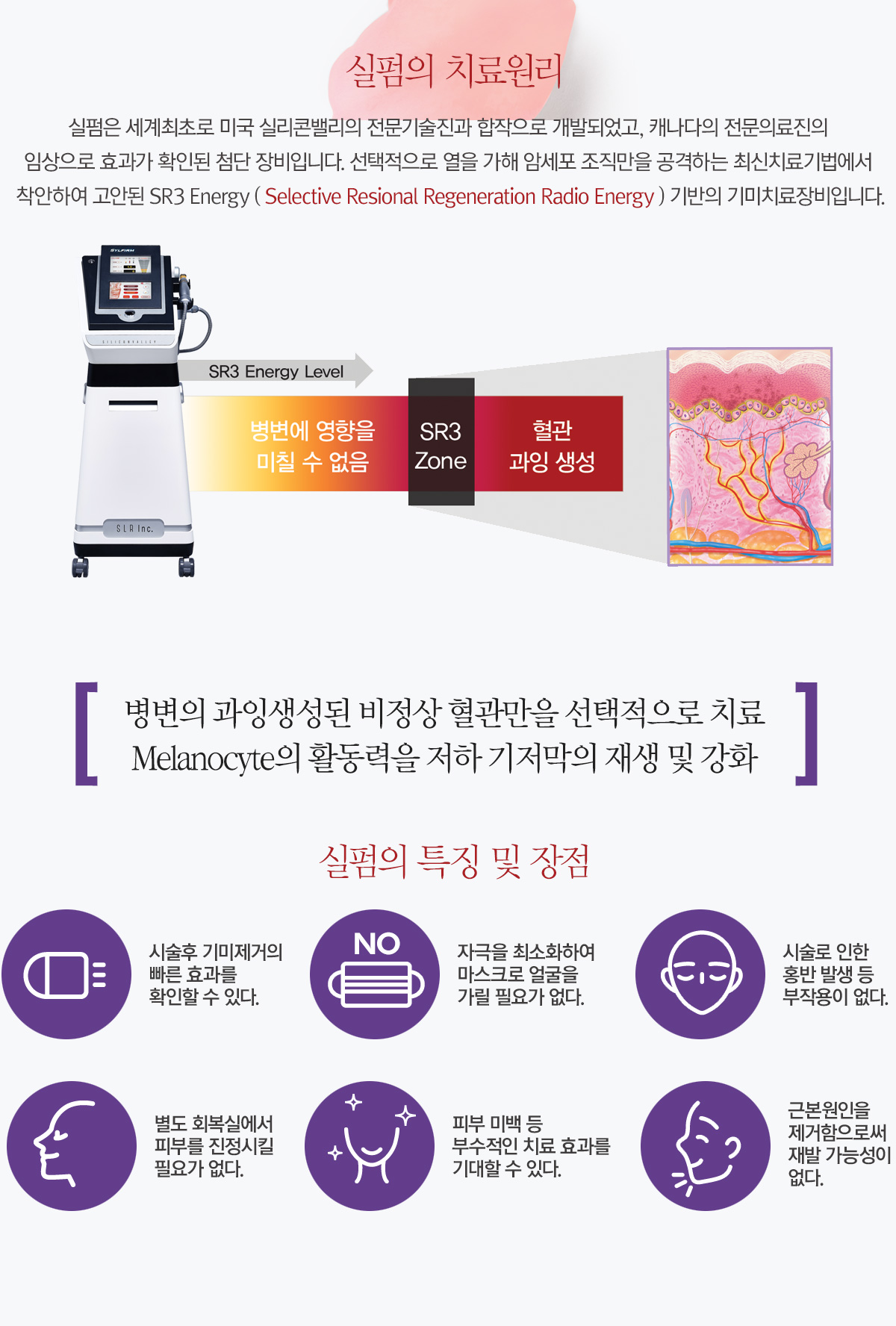 진피층전체에 작용, 이상발달한 혈관을 제거하여 기미, 홍조, 색소침착의 근본원인을 차단합니다.