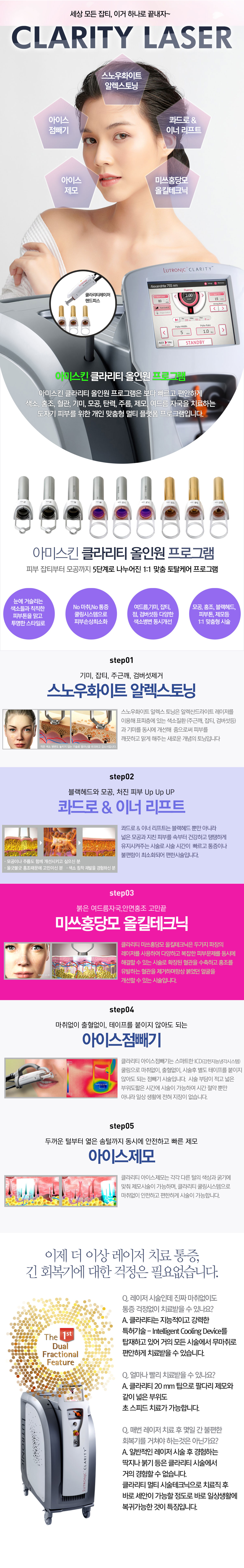 아미스킨 클라리티 올인원 프로그램은 색소, 홍조, 혈관, 기미, 모공, 탄력,주름, 제모, 여드름 자국을 치료하는 도자기 피부를 위한 개인 맞춤형 멀티 플랫폼 프로그램 입니다.