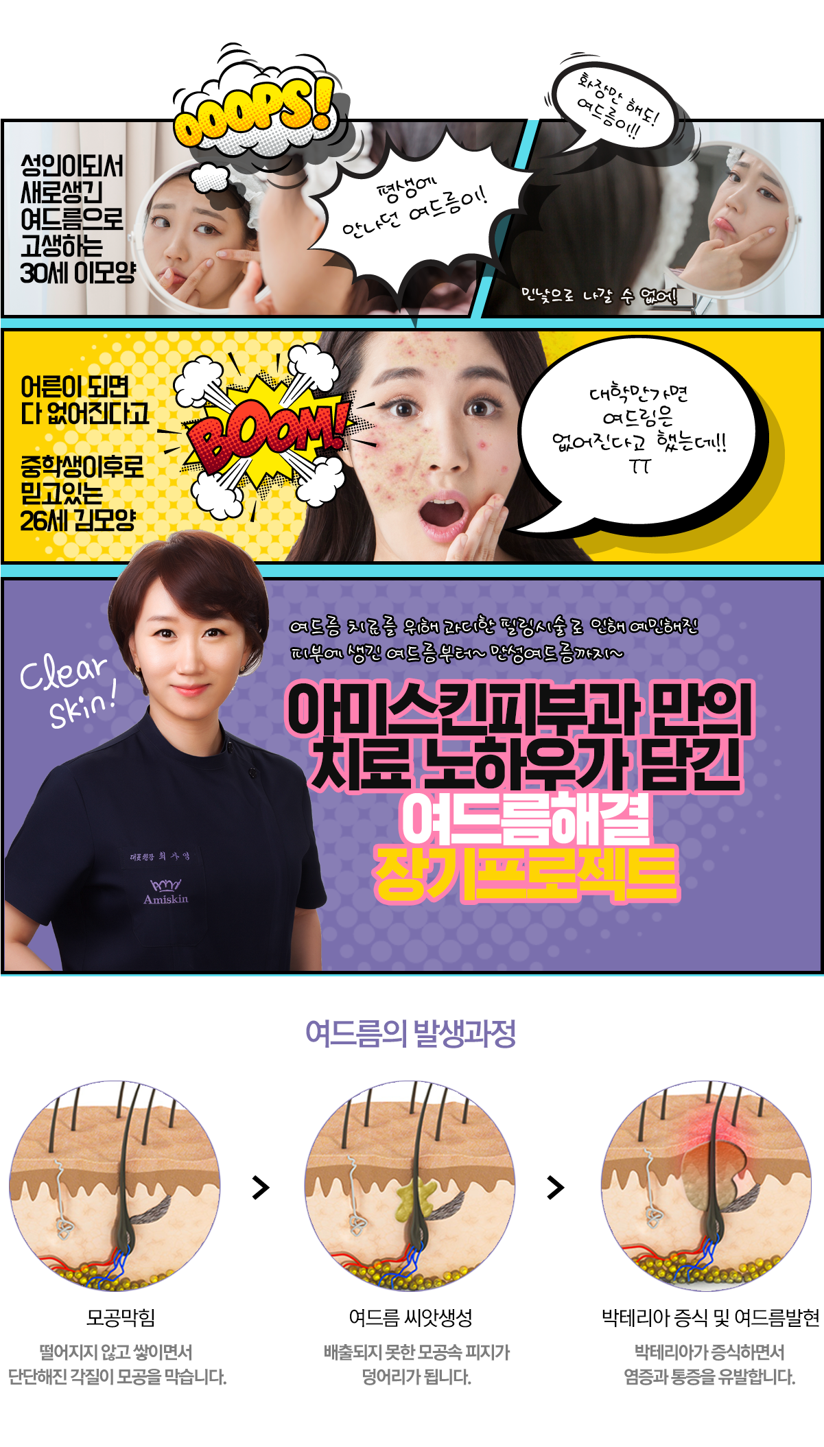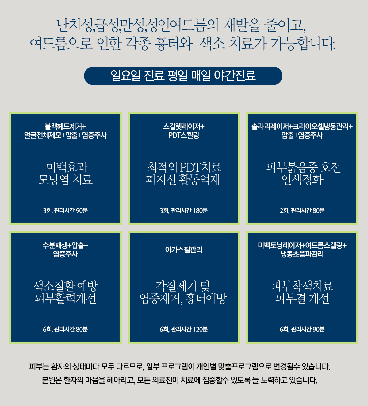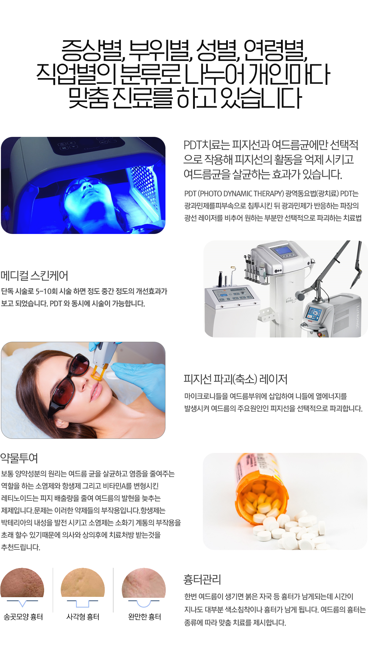 오랫동안 축적된 원장님의 노하우와 수많은 여드름 임상케이스를 통해 만들어진 만성저거인 여드름에 근본적인 치료를 받을수 있는 최적화된 프로그램입니다.